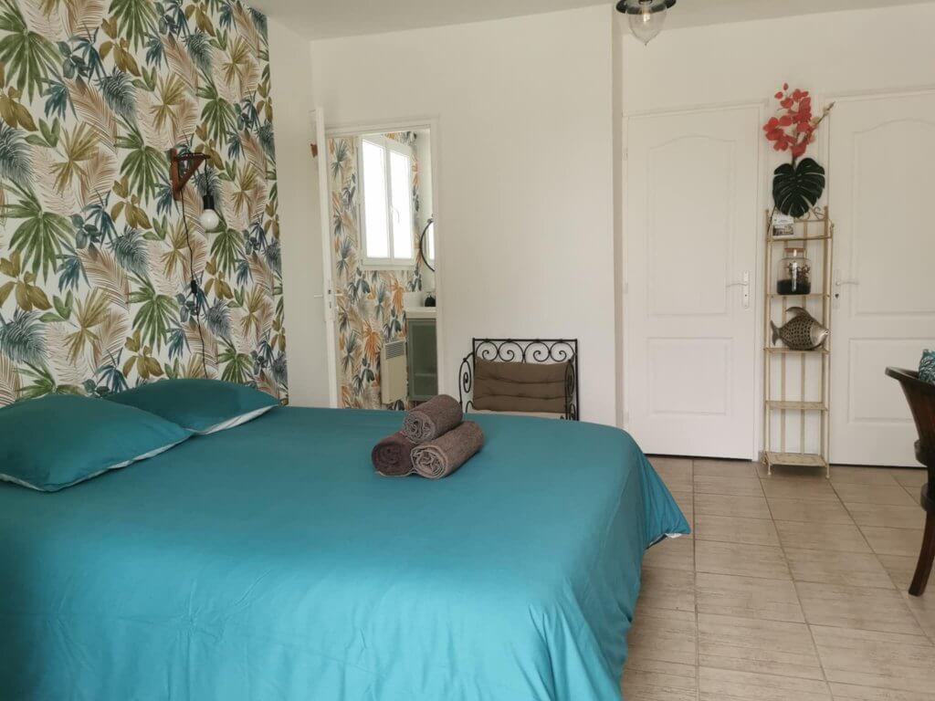 La chambre Fleur de Sel, la plus spacieuse de notre établissement, vous invite à l’évasion. Ses murs ornés d’un papier peint aux motifs végétaux créent une ambiance apaisante et dépaysante.